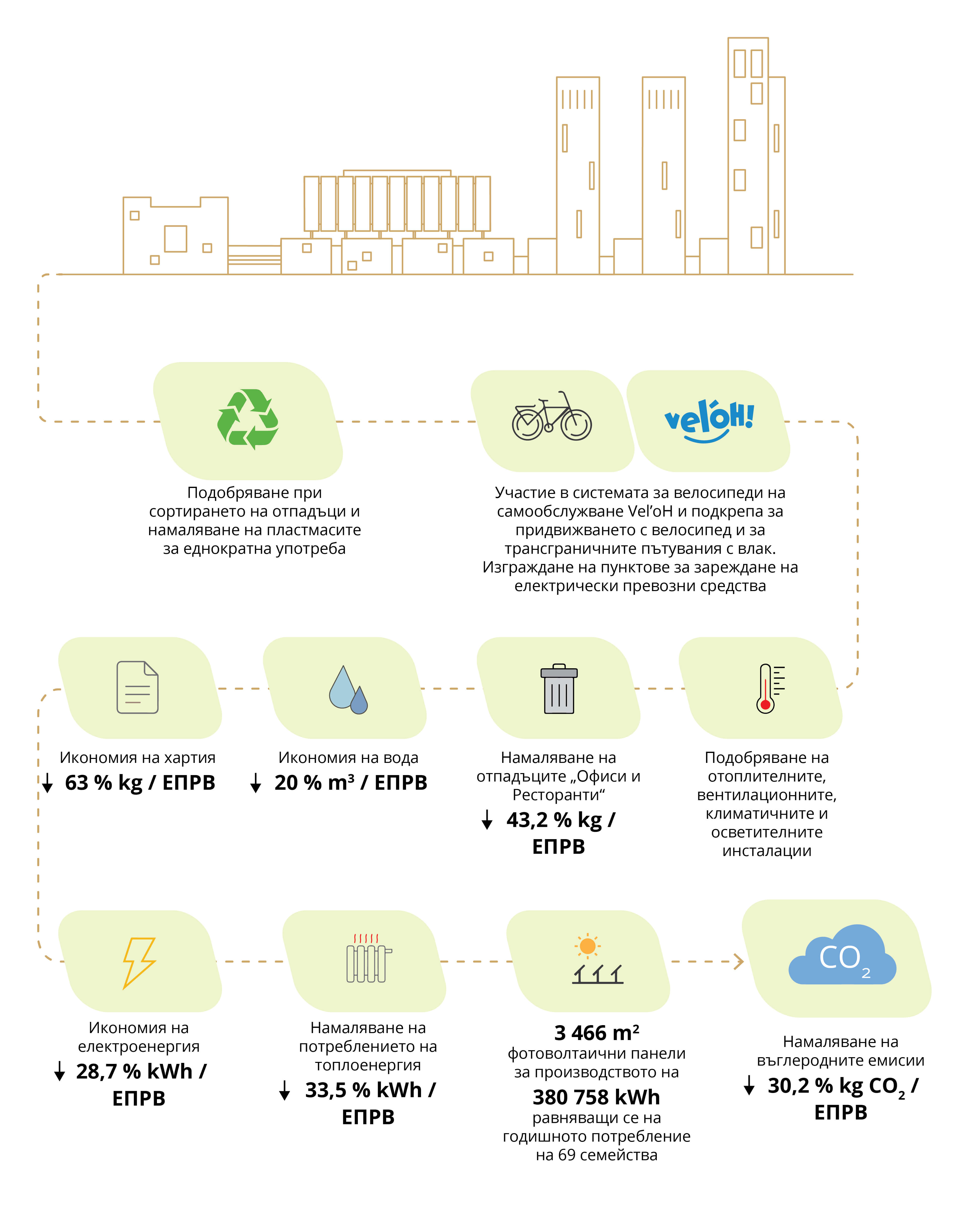 - Намаляване на въглеродните емисии - 30,2 % kg CO2/EПРВ