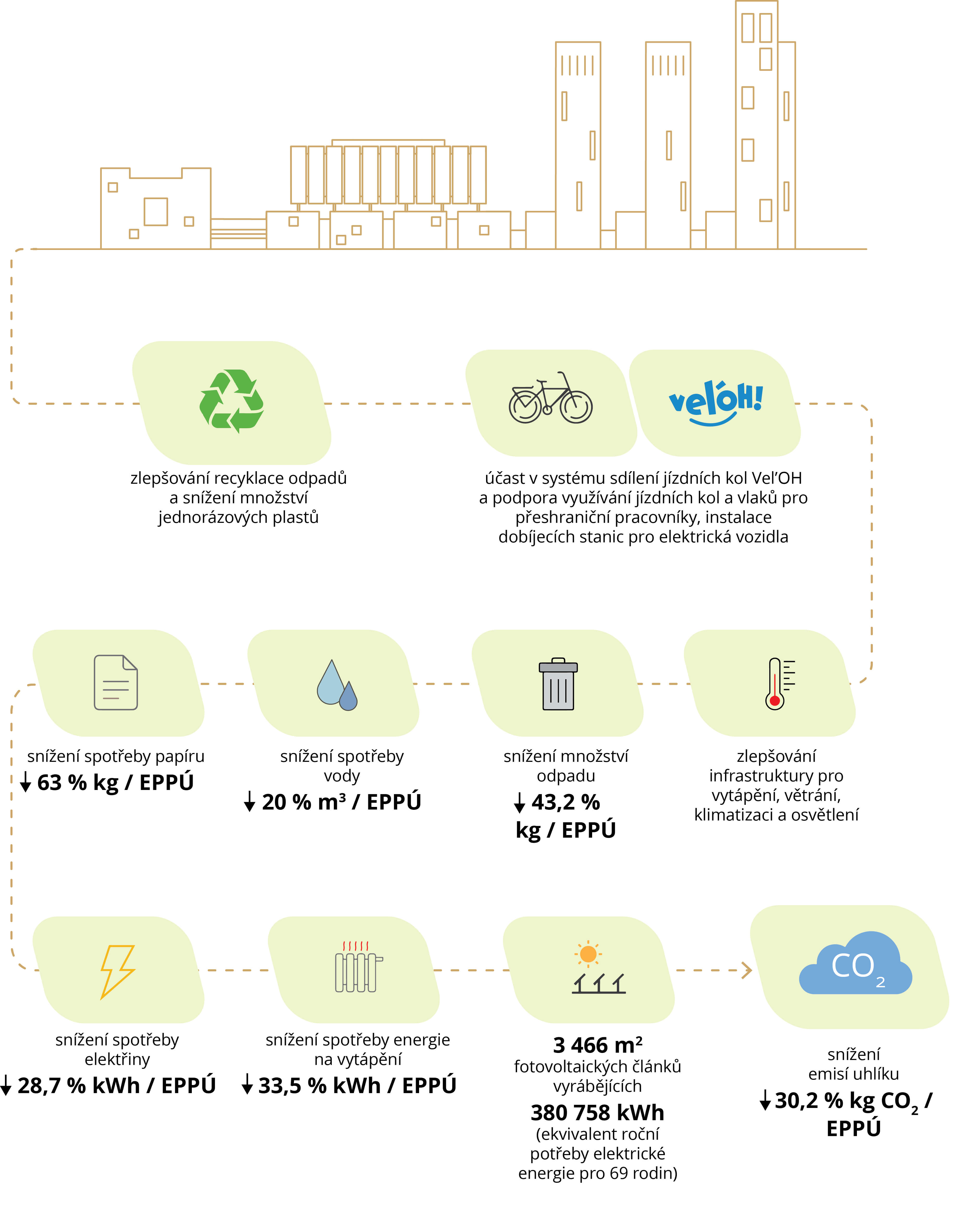 - snížení emisí uhlíku - 30.2 % kg CO2/ekvivalent plného pracovního úvazku